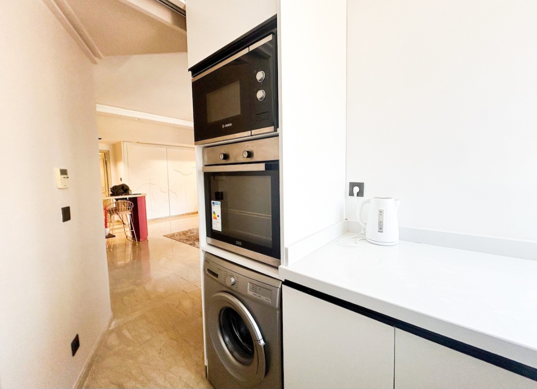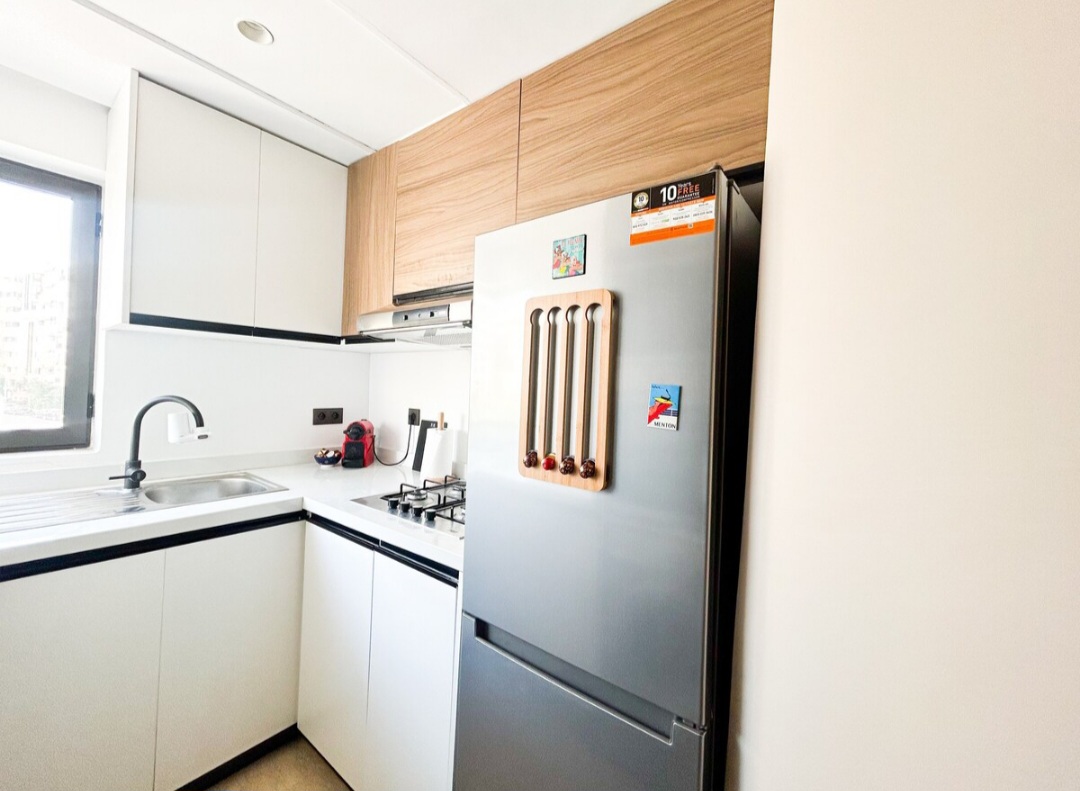 L’appartement se dispose d’un salon ouvert et aéré avec un grand fauteuil confortable pour regarder la télé, en plus d’une petite salle à manger style américain à côté de la cuisine entièrement équipée avec des appareils modernes s’intègre parfaitement à l’espace de vie, créant une ambiance pratique et fonctionnelle. sans oublier le balcon très cosy où vous pouvez profiter du coucher de soleil.