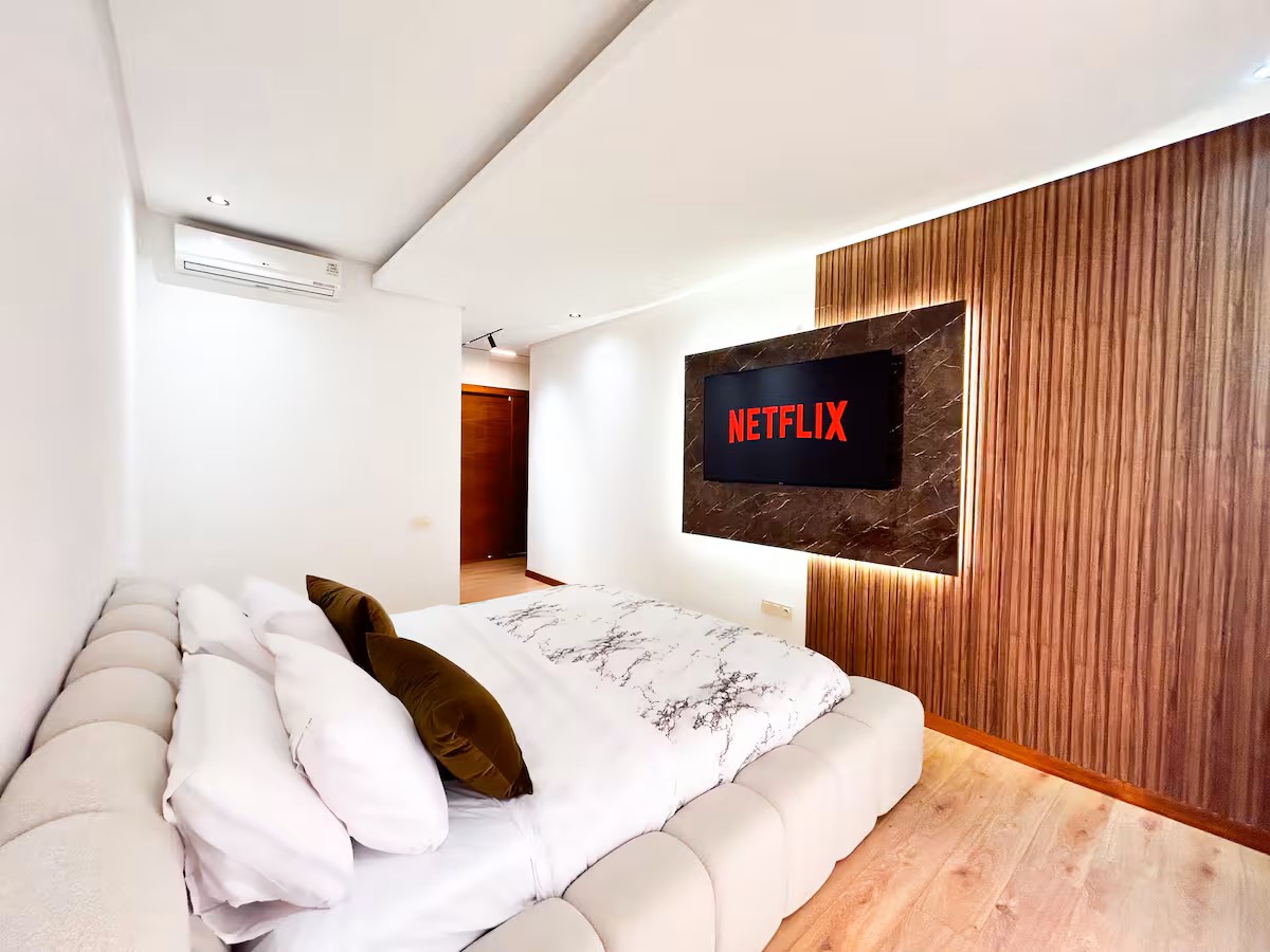 Cet appartement spacieux et lumineux est idéal pour un séjour haut de gamme. Il se compose de trois chambres, dont une suite royale avec salle de bain privative et télévision. Les matelas, soigneusement choisis pour leur confort, vous garantiront des nuits reposantes.