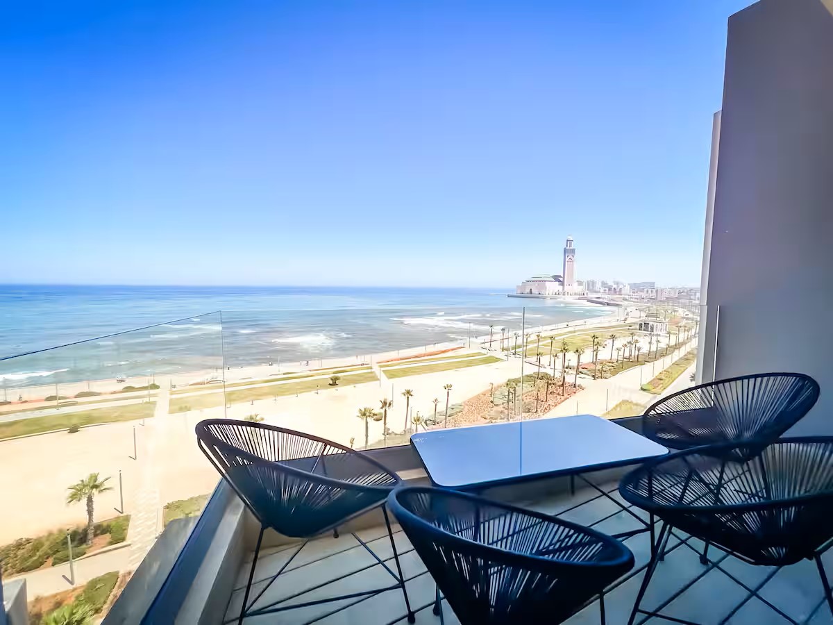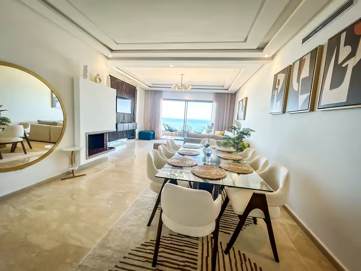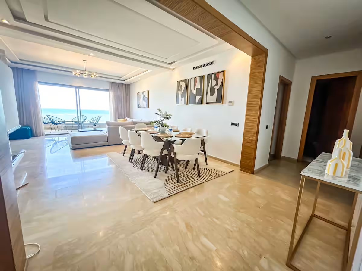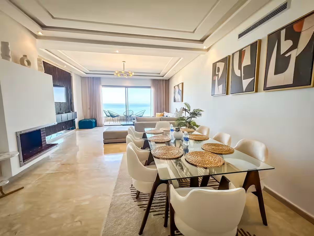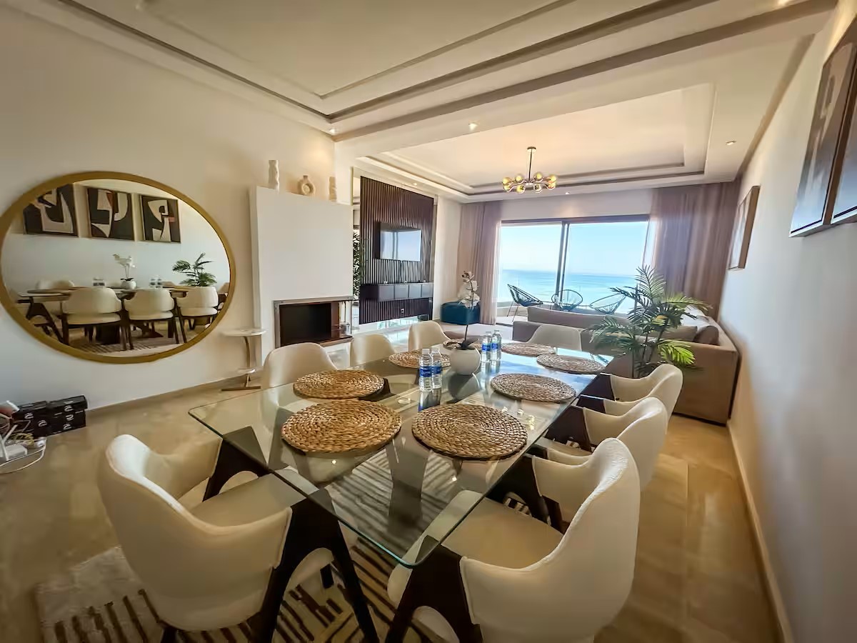Cet appartement moderne et spacieux, situé dans une résidence sécurisée, est idéal pour un séjour confortable et relaxant. Il dispose de trois chambres, dont une suite parentale avec salle de bain privative. Le salon est aménagé avec un cosy canapé en L, parfait pour se détendre, et un coin salle à manger pour partager vos repas. La cuisine est entièrement équipée, offrant tout le nécessaire pour cuisiner facilement. Le salon s’ouvre sur un balcon qui surplombe la mer, offrant une vue magnifique sur l’océan, visible également depuis l’intérieur du salon. Le balcon principal propose une vue imprenable sur la mer et sur la majestueuse mosquée Hassan II, que l’on peut également admirer depuis la suite parentale.