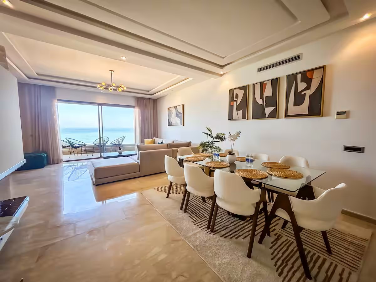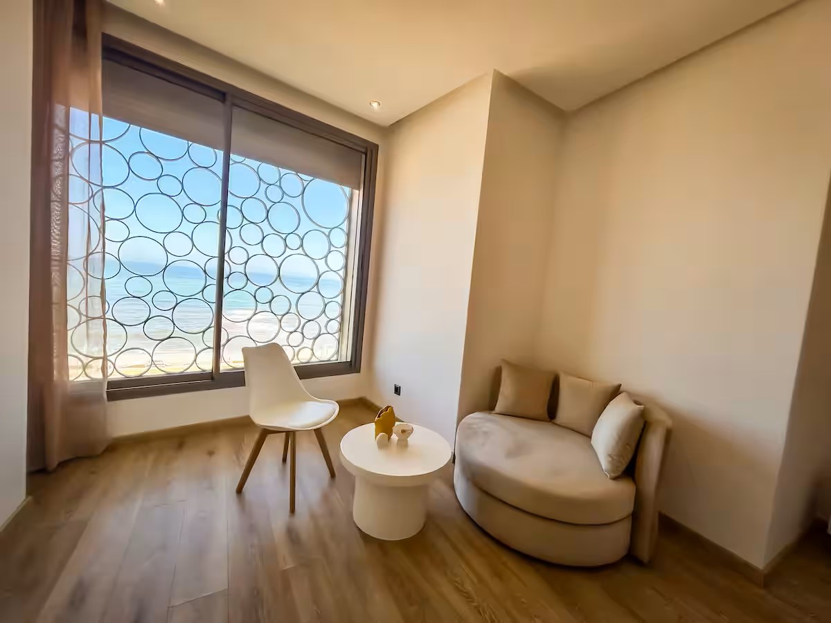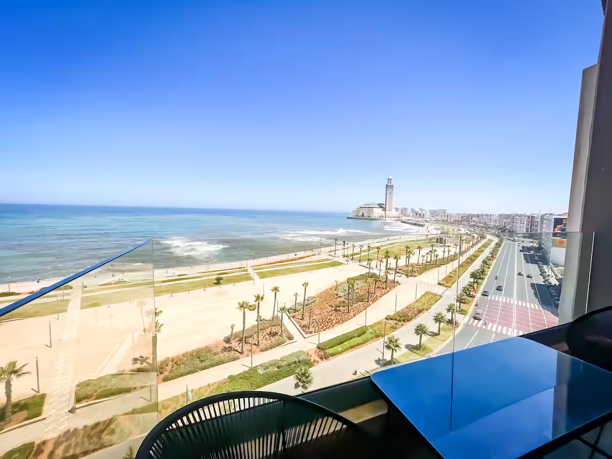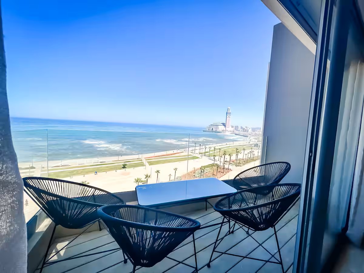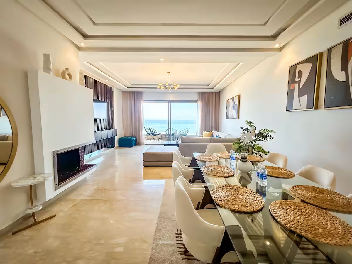 Cet appartement moderne et spacieux, situé dans une résidence sécurisée, est idéal pour un séjour confortable et relaxant. Il dispose de trois chambres, dont une suite parentale avec salle de bain privative. Le salon est aménagé avec un cosy canapé en L, parfait pour se détendre, et un coin salle à manger pour partager vos repas. La cuisine est entièrement équipée, offrant tout le nécessaire pour cuisiner facilement. Le salon s’ouvre sur un balcon qui surplombe la mer, offrant une vue magnifique sur l’océan, visible également depuis l’intérieur du salon. Le balcon principal propose une vue imprenable sur la mer et sur la majestueuse mosquée Hassan II, que l’on peut également admirer depuis la suite parentale.