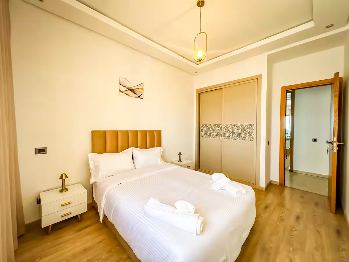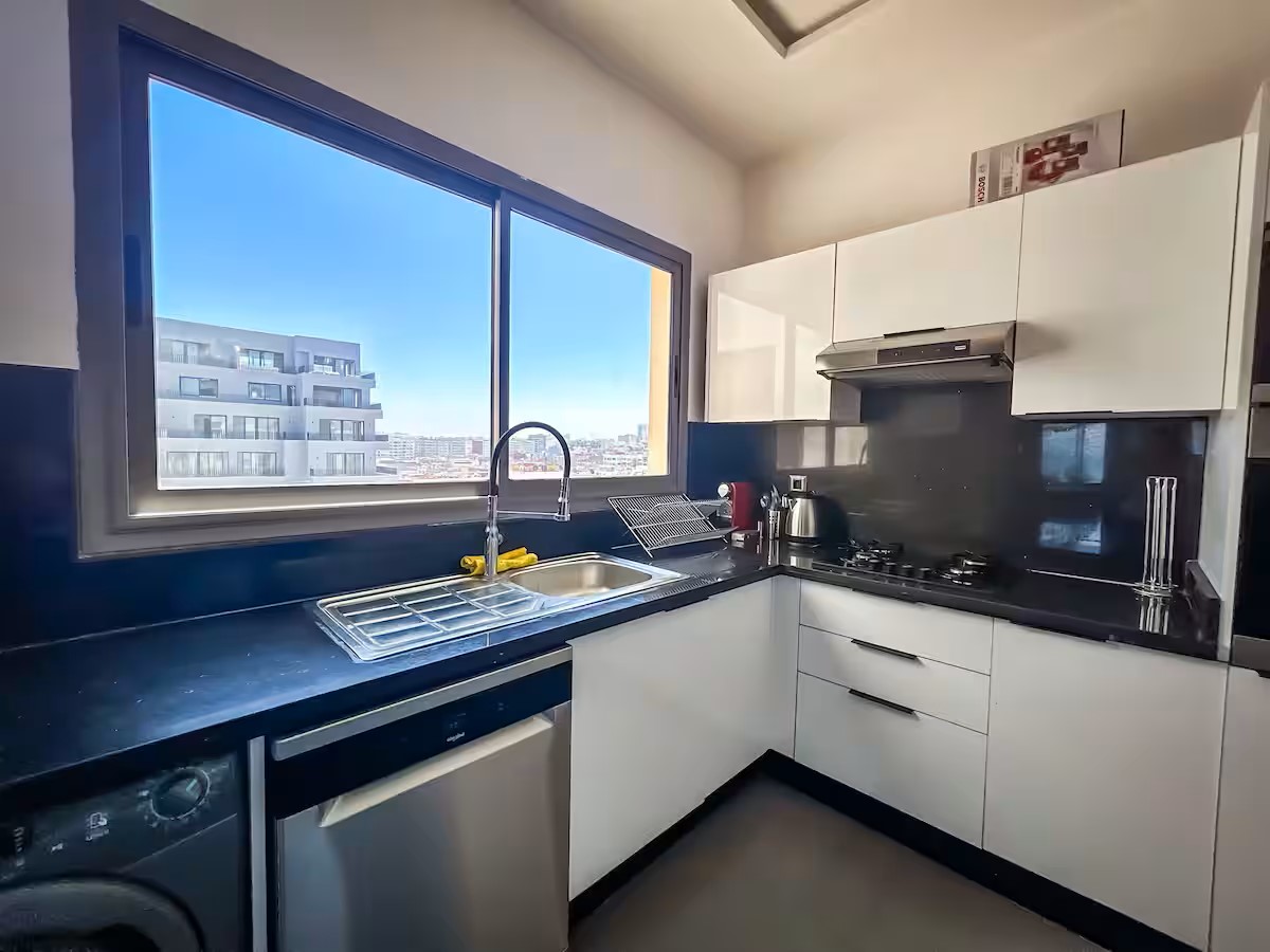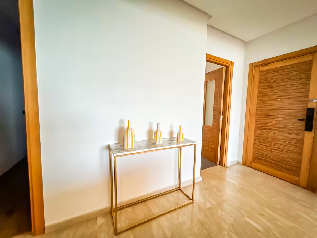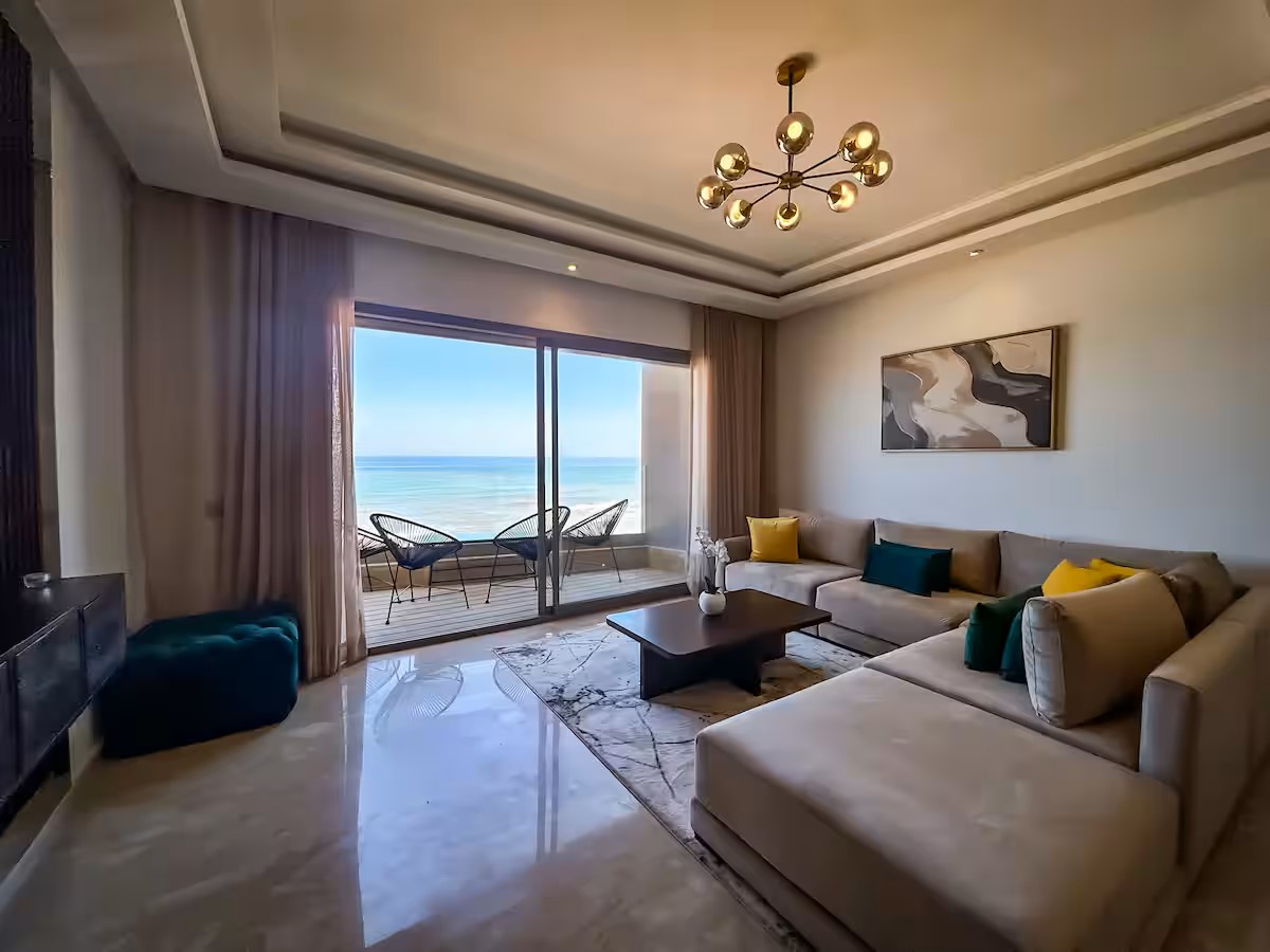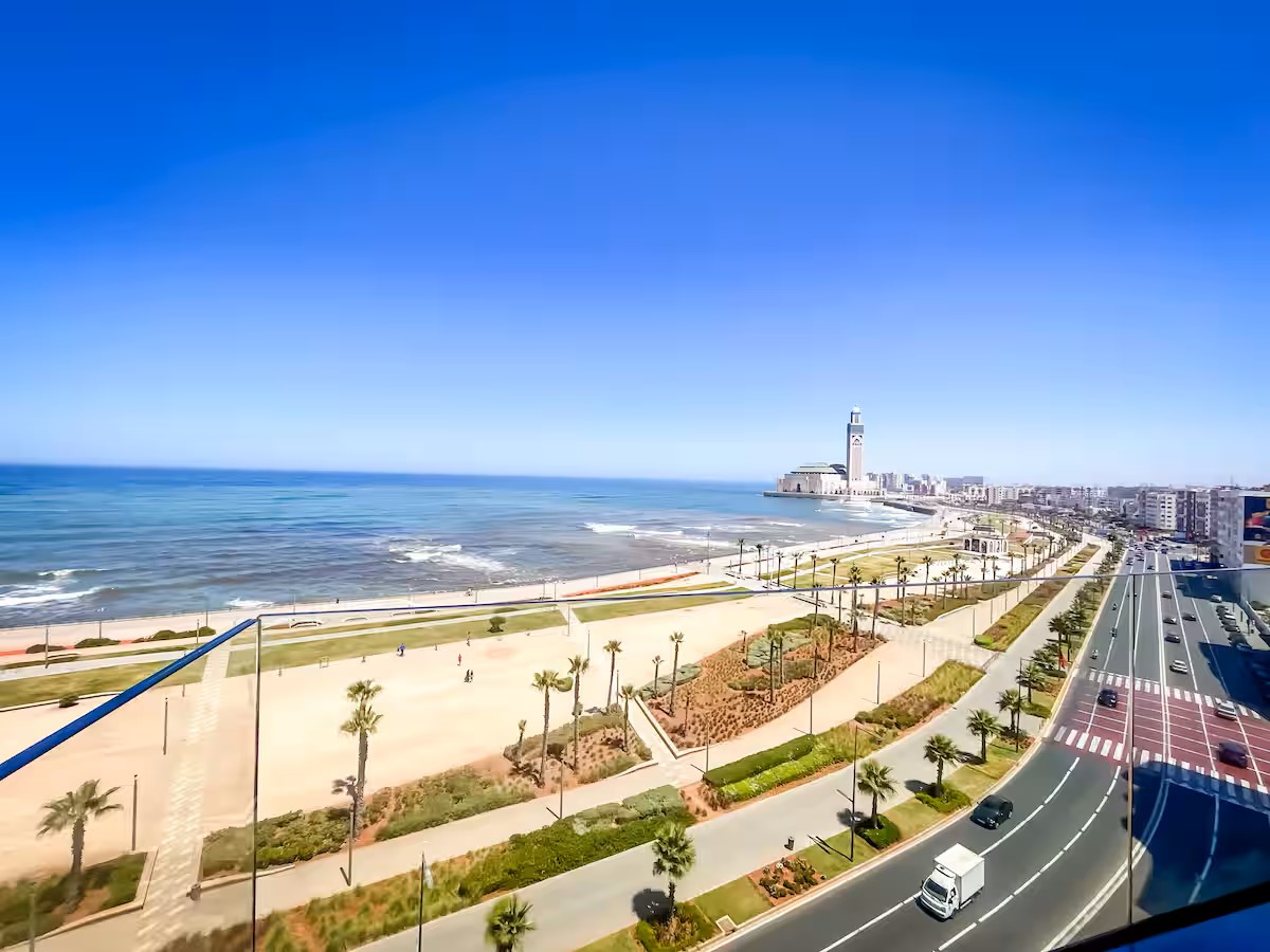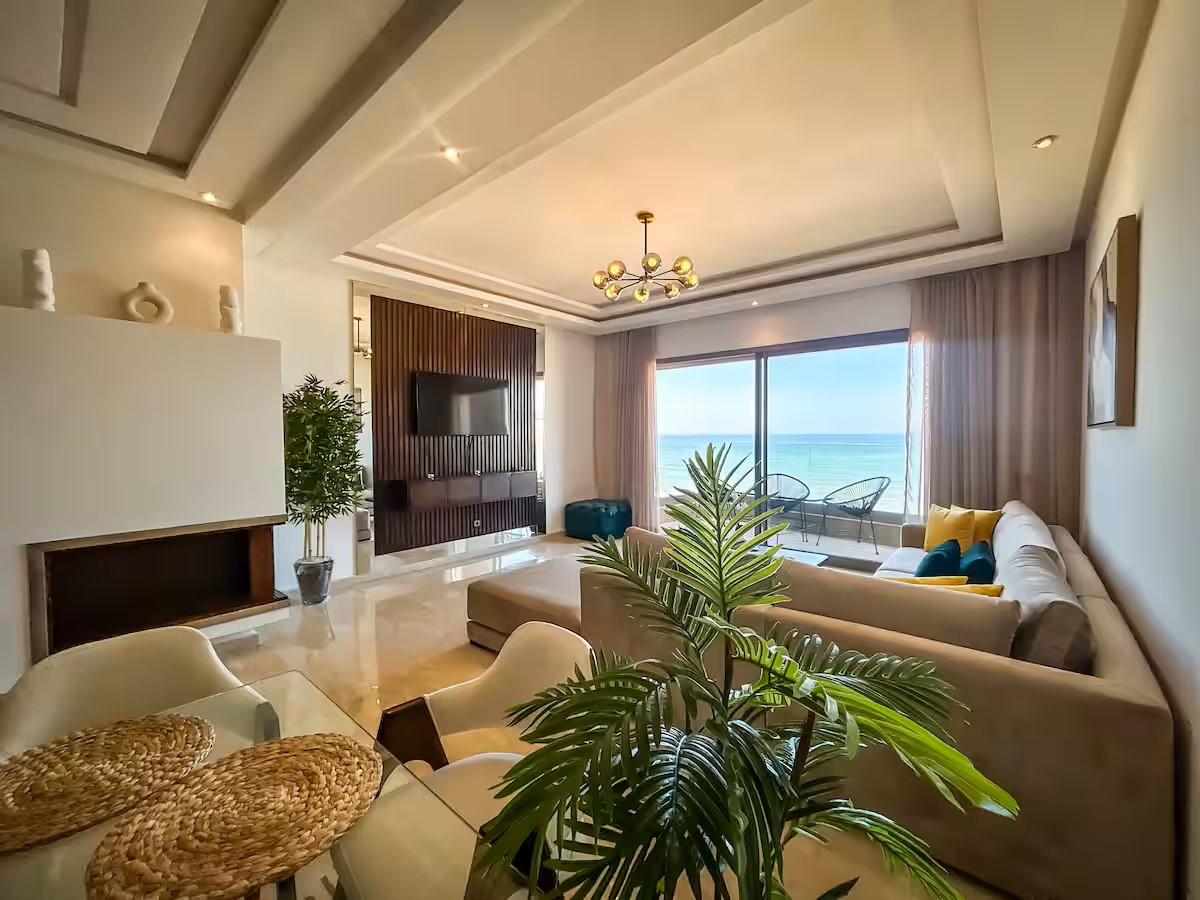 Cet appartement moderne et spacieux, situé dans une résidence sécurisée, est idéal pour un séjour confortable et relaxant. Il dispose de trois chambres, dont une suite parentale avec salle de bain privative. Le salon est aménagé avec un cosy canapé en L, parfait pour se détendre, et un coin salle à manger pour partager vos repas. La cuisine est entièrement équipée, offrant tout le nécessaire pour cuisiner facilement. Le salon s’ouvre sur un balcon qui surplombe la mer, offrant une vue magnifique sur l’océan, visible également depuis l’intérieur du salon. Le balcon principal propose une vue imprenable sur la mer et sur la majestueuse mosquée Hassan II, que l’on peut également admirer depuis la suite parentale.