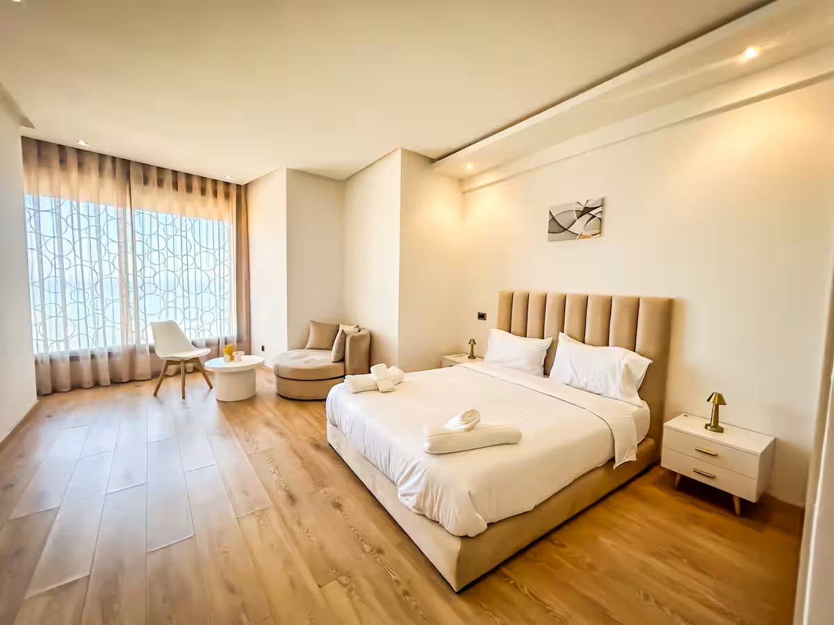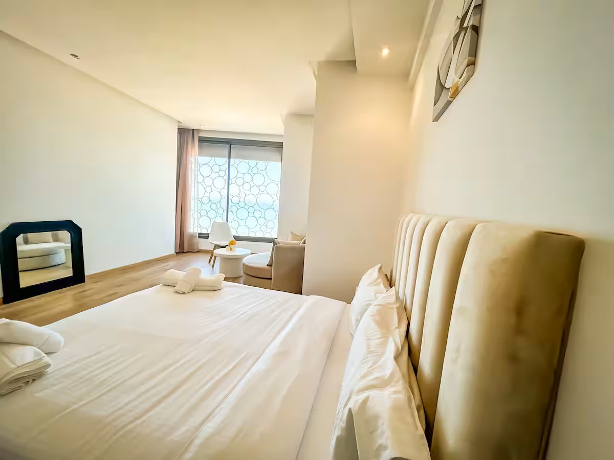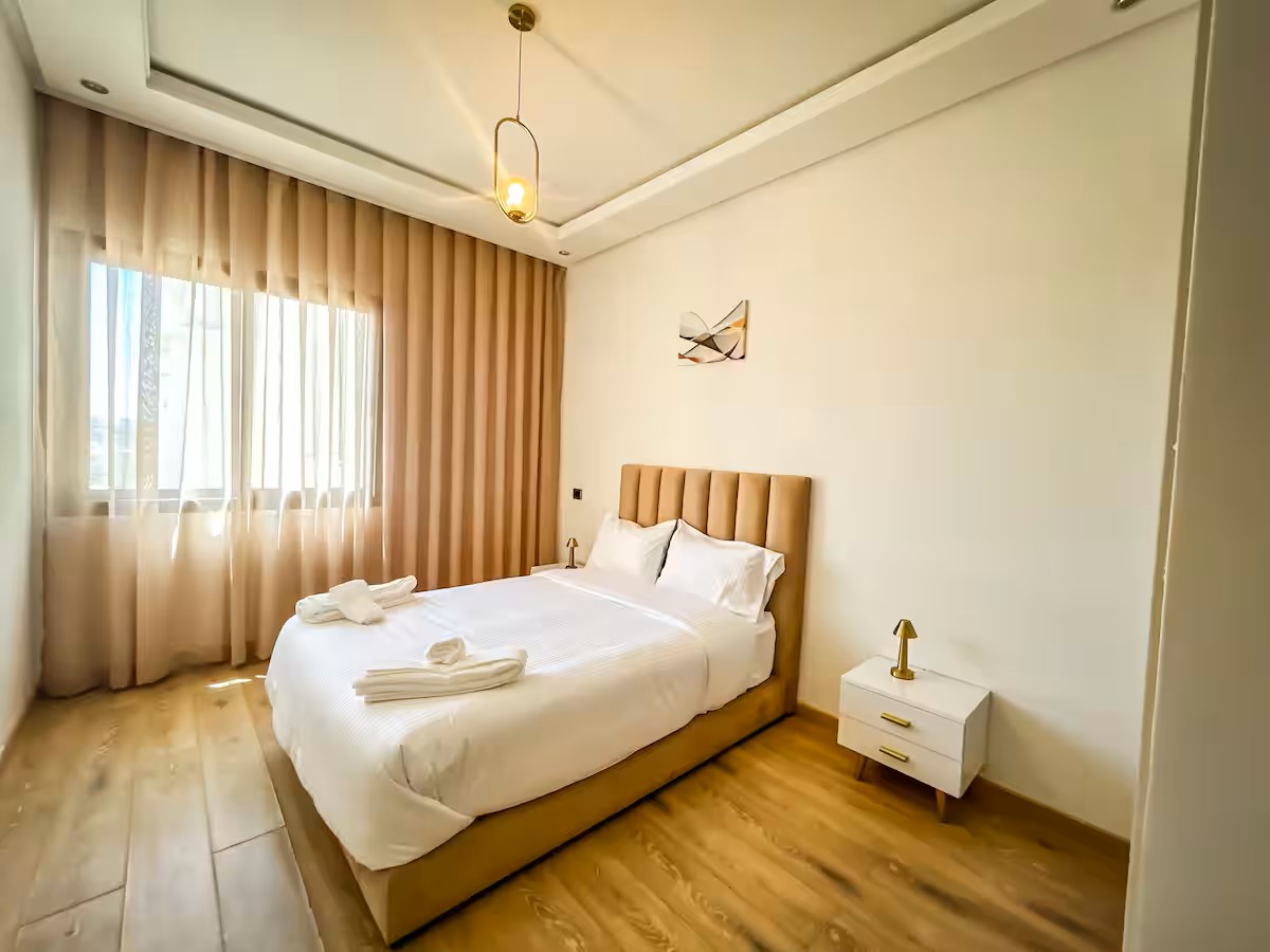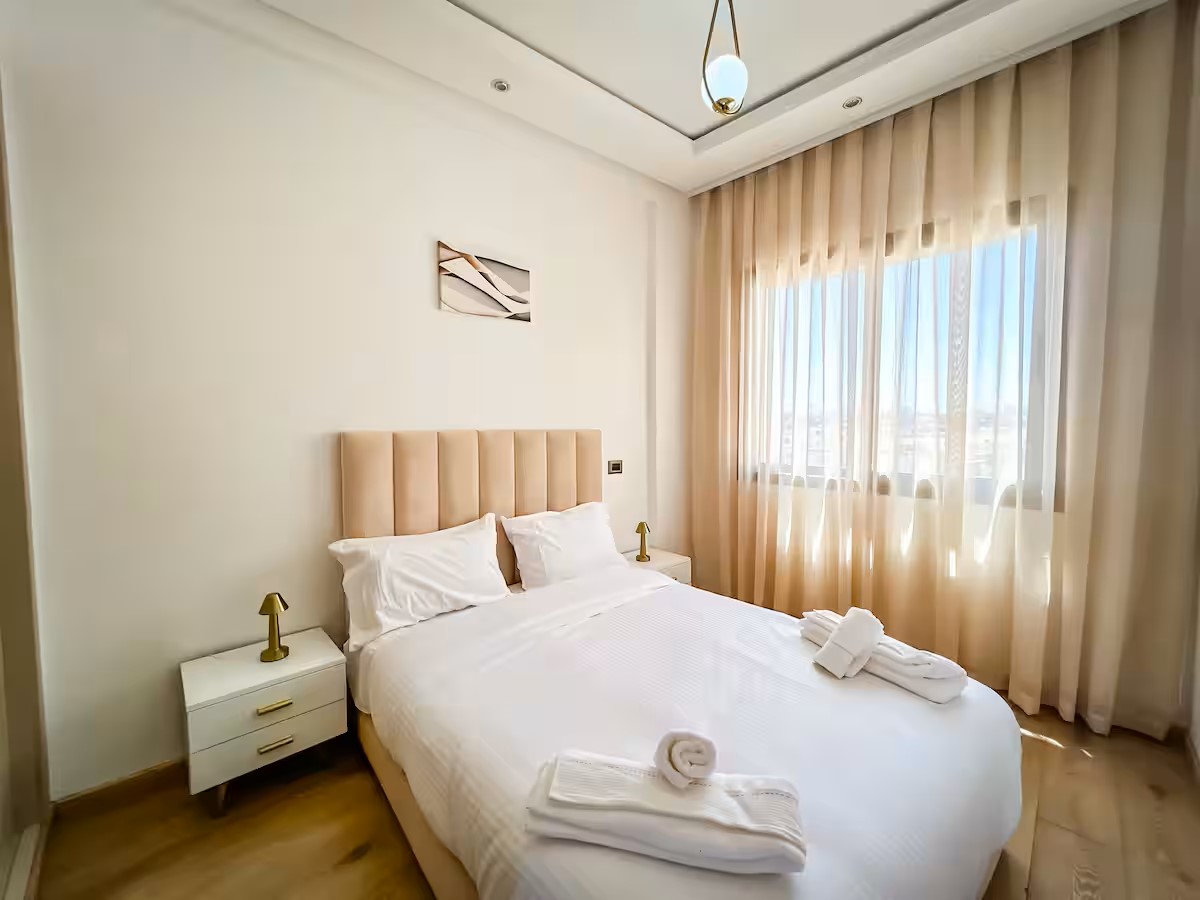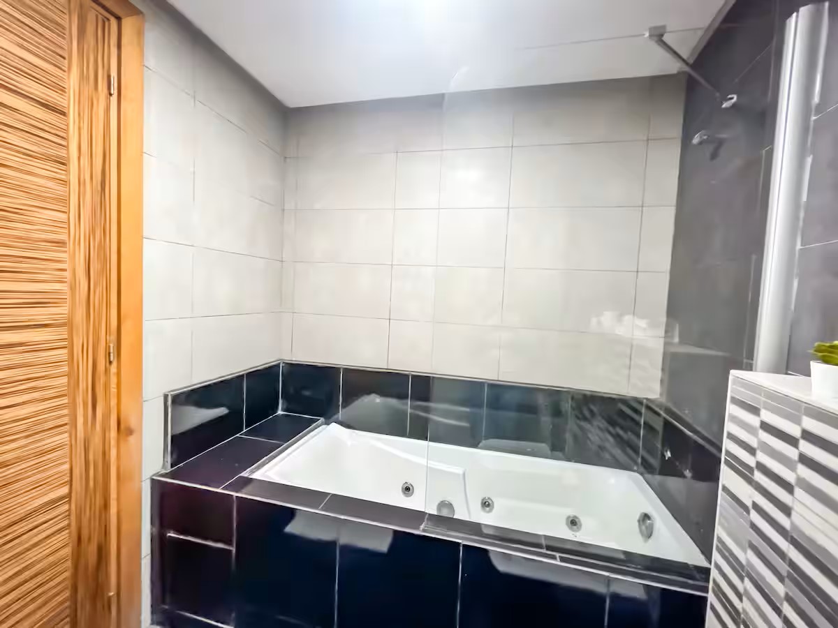 Cet appartement moderne et spacieux, situé dans une résidence sécurisée, est idéal pour un séjour confortable et relaxant. Il dispose de trois chambres, dont une suite parentale avec salle de bain privative. Le salon est aménagé avec un cosy canapé en L, parfait pour se détendre, et un coin salle à manger pour partager vos repas. La cuisine est entièrement équipée, offrant tout le nécessaire pour cuisiner facilement. Le salon s’ouvre sur un balcon qui surplombe la mer, offrant une vue magnifique sur l’océan, visible également depuis l’intérieur du salon. Le balcon principal propose une vue imprenable sur la mer et sur la majestueuse mosquée Hassan II, que l’on peut également admirer depuis la suite parentale.