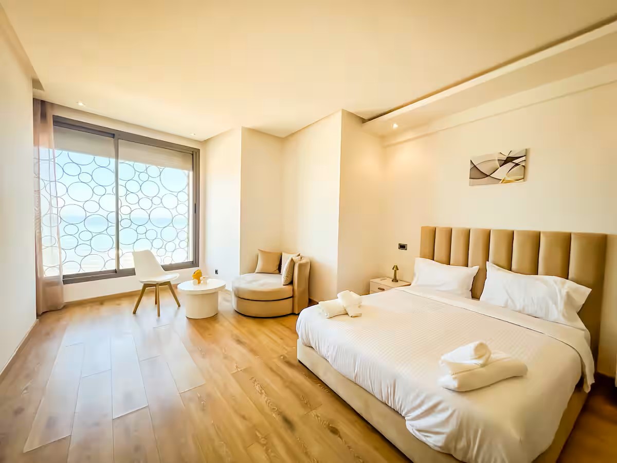 Le salon s’ouvre sur un balcon qui surplombe la mer, offrant une vue magnifique sur l’océan, visible également depuis l’intérieur du salon. Le balcon principal propose une vue imprenable sur la mer et sur la majestueuse mosquée Hassan II, que l’on peut également admirer depuis la suite parentale. Un cadre exceptionnel pour profiter de votre séjour.