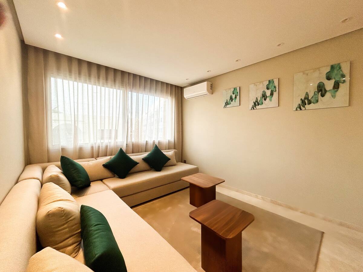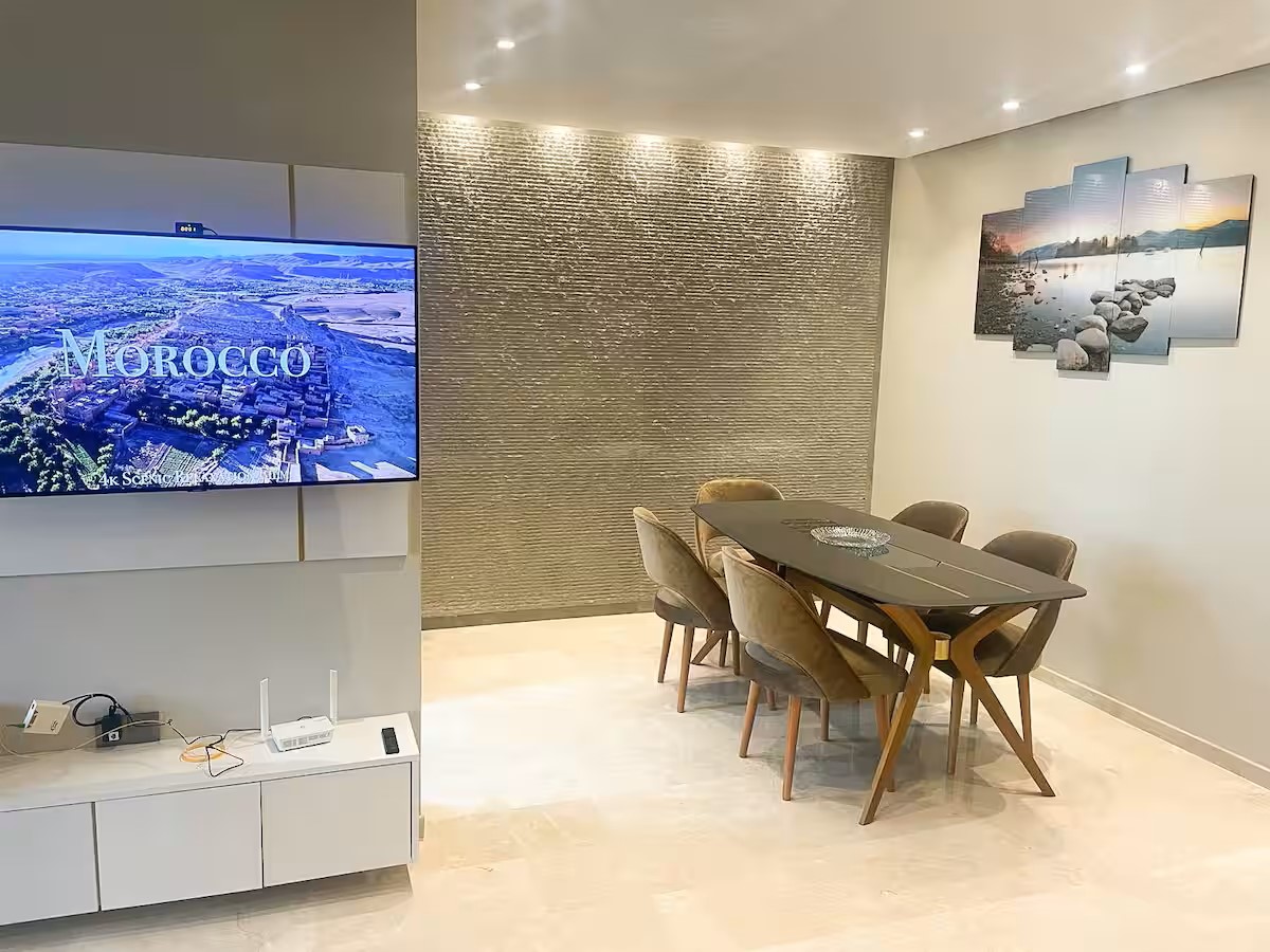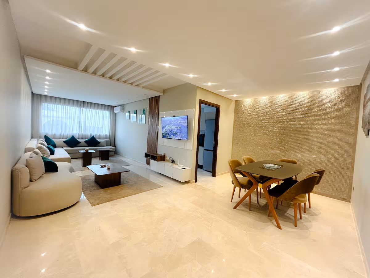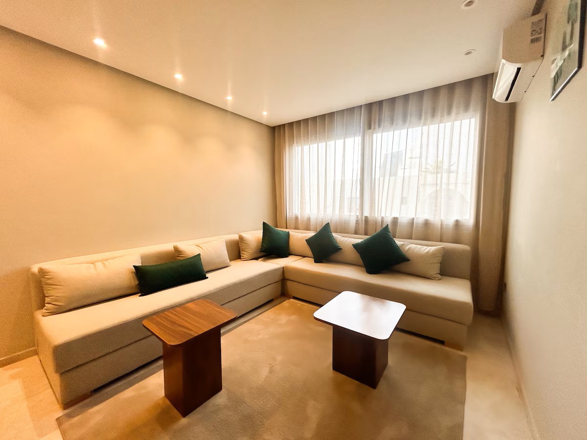 L’espace de vie comprend un coin salle à manger convivial, un double salon lumineux équipé d’une télévision avec IPTV, parfait pour vos soirées, et une cuisine moderne entièrement équipée pour répondre à tous vos besoins.