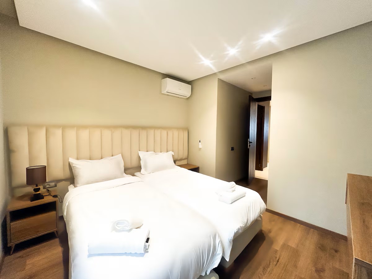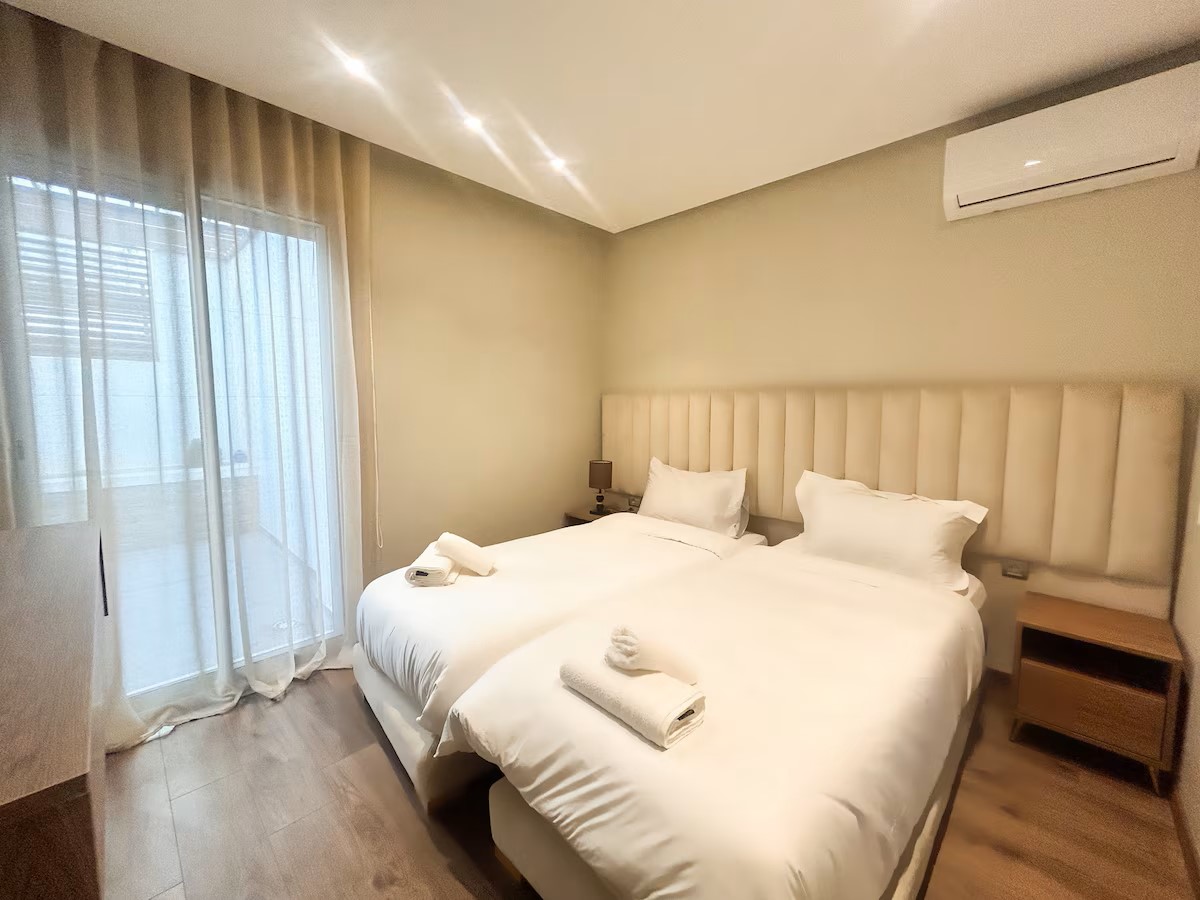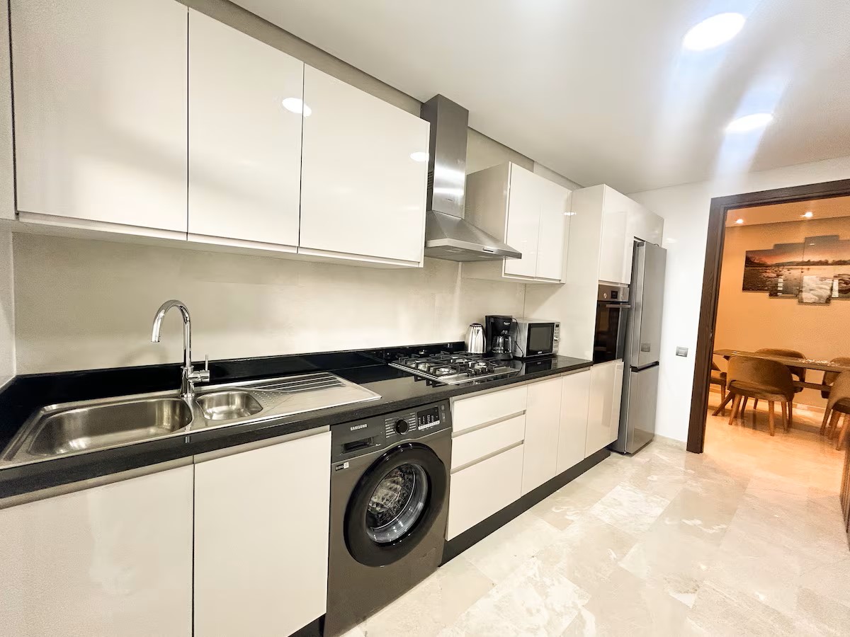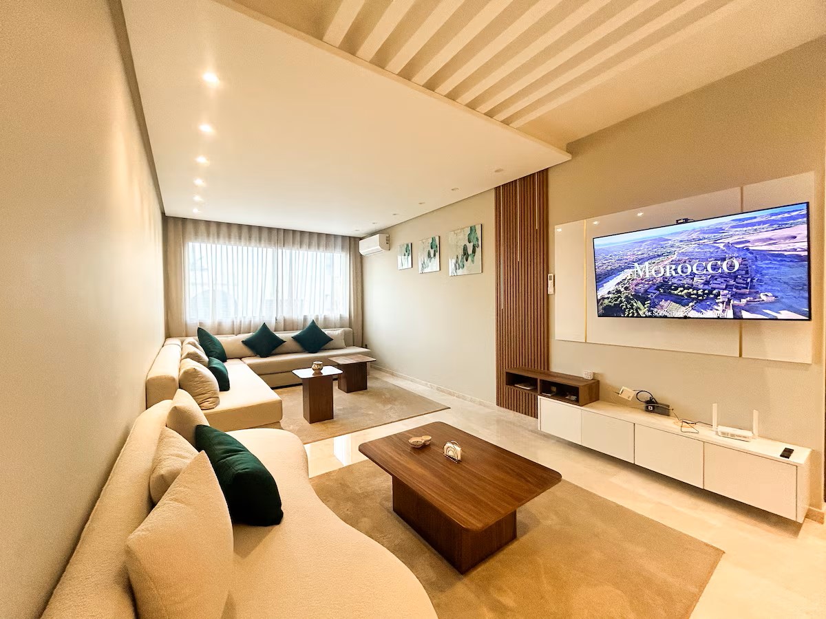L’espace de vie comprend un coin salle à manger convivial, un double salon lumineux équipé d’une télévision avec IPTV, parfait pour vos soirées, et une cuisine moderne entièrement équipée pour répondre à tous vos besoins.