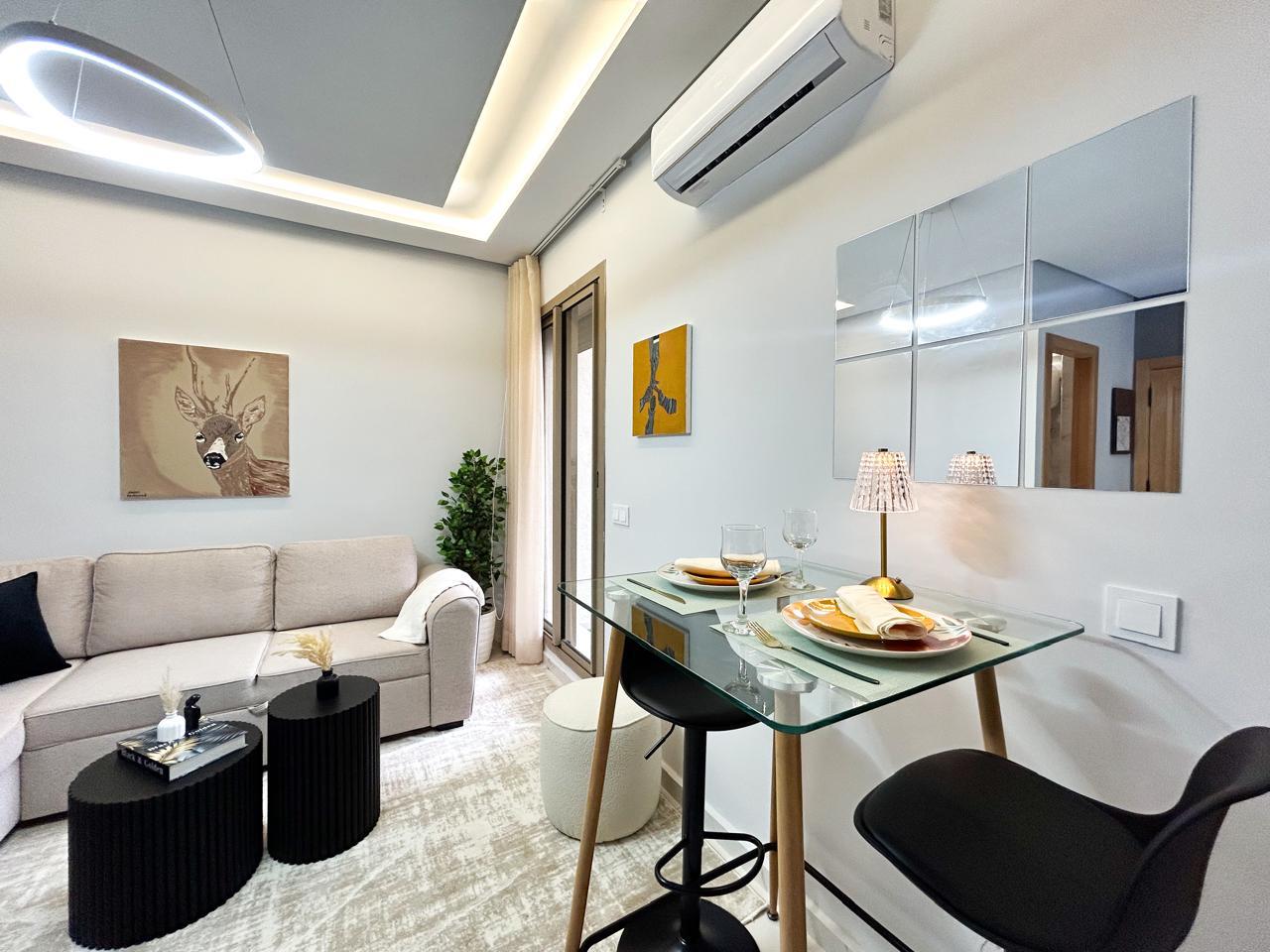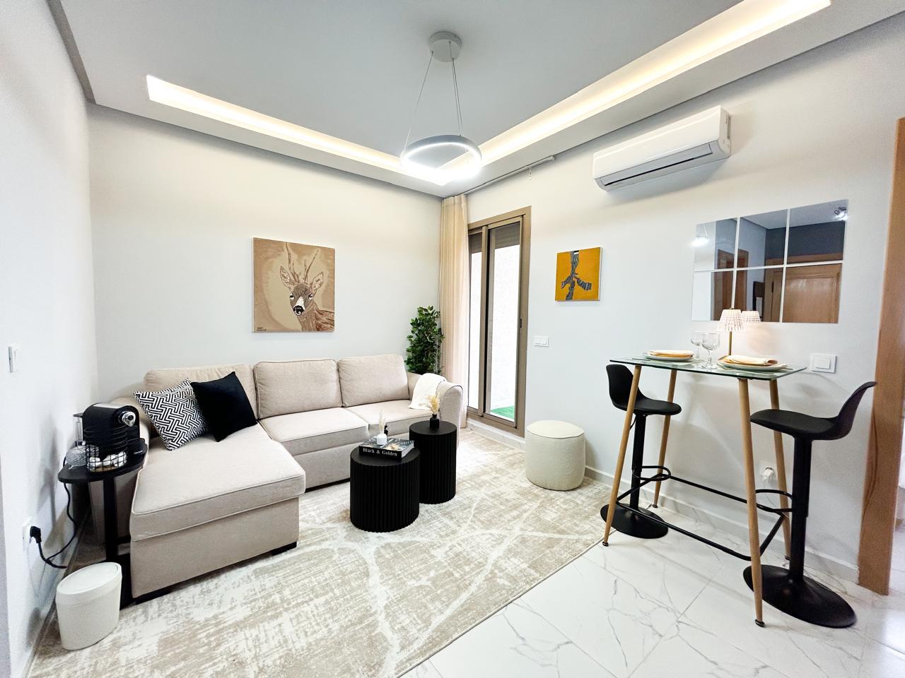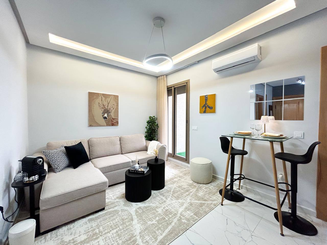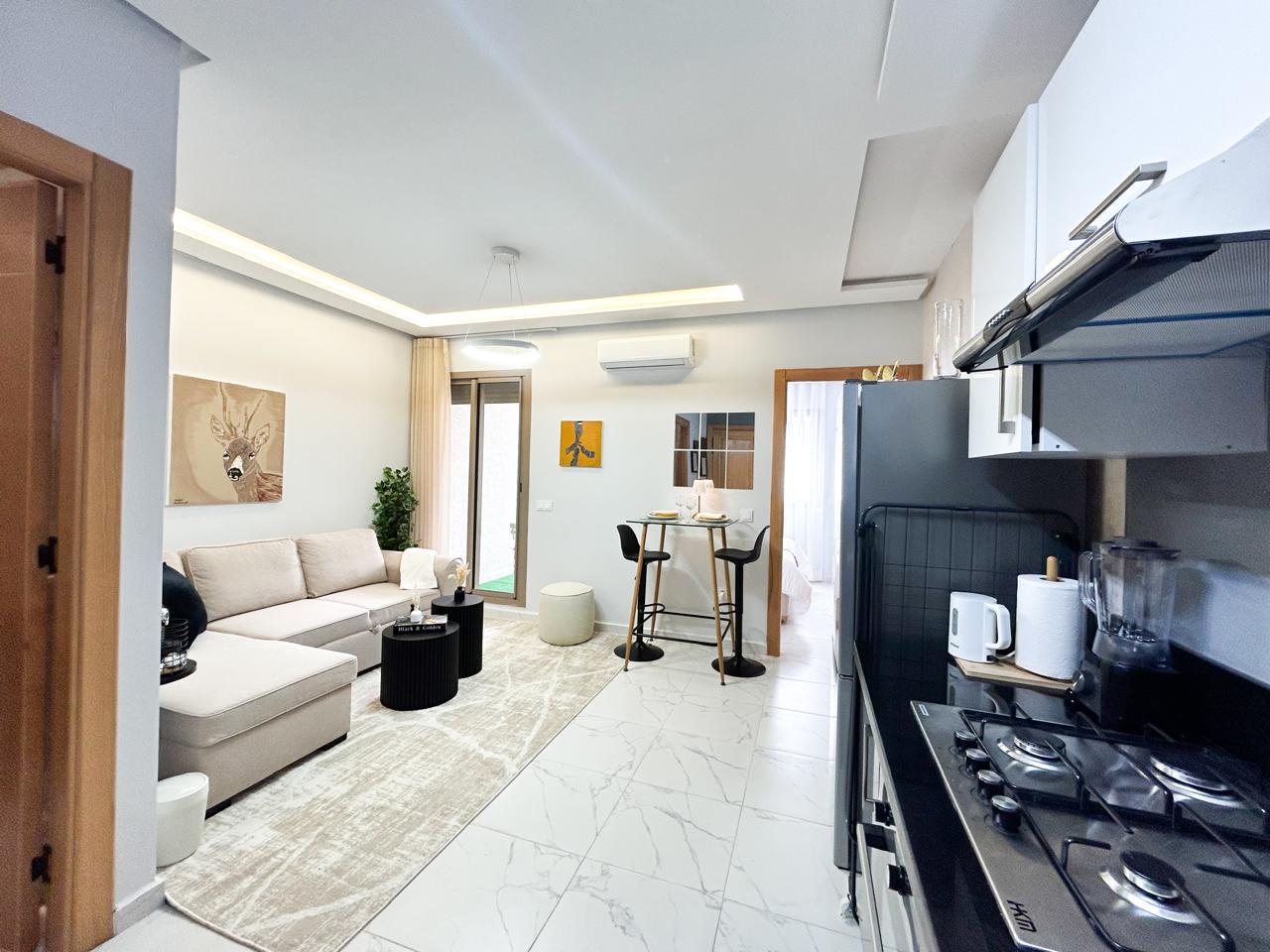 Appartement moderne d’une chambre avec un salon moderne, une cuisine américaine ouverte et un balcon, parfait pour profiter de moments de détente.