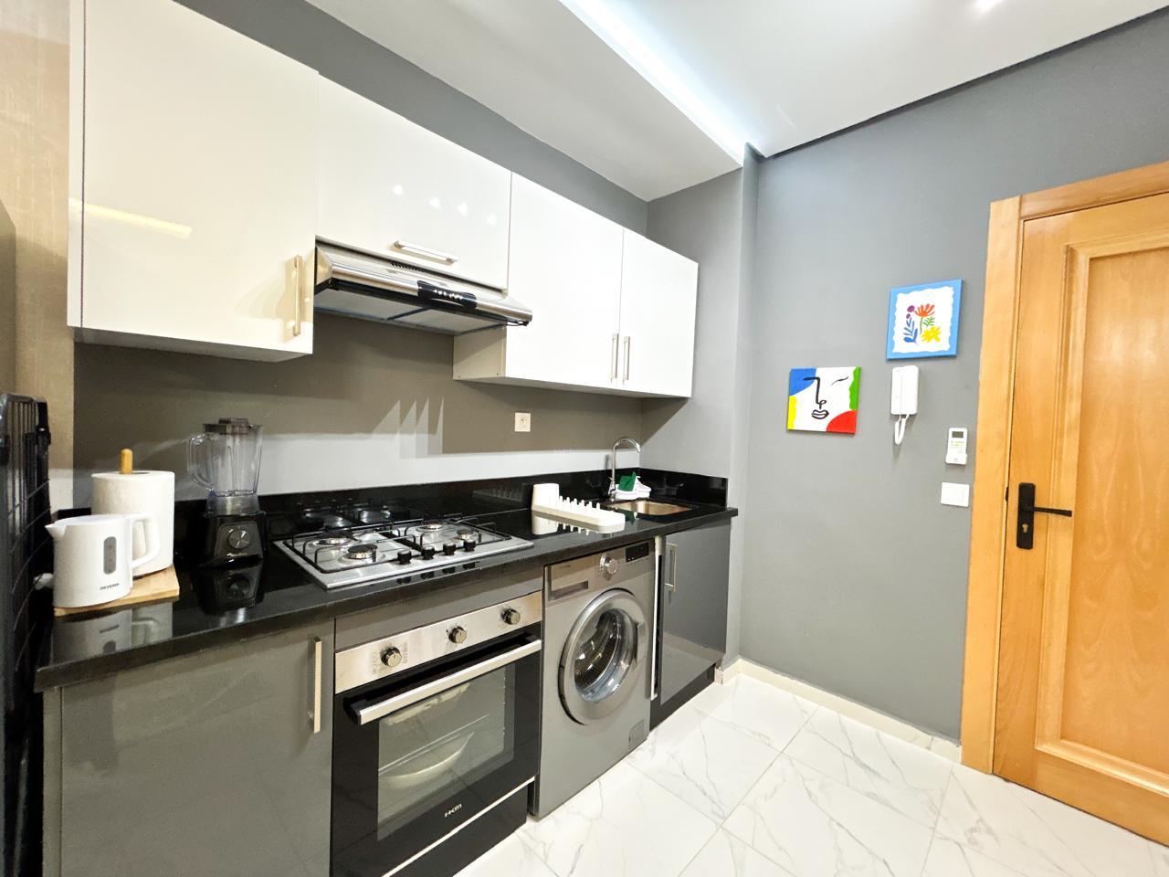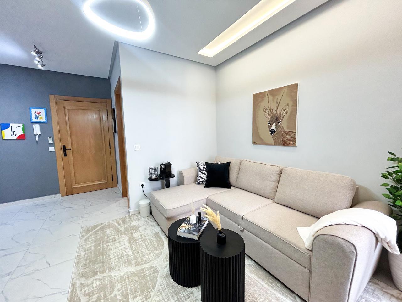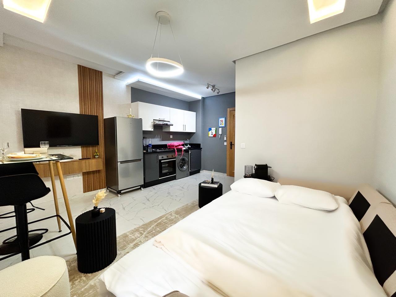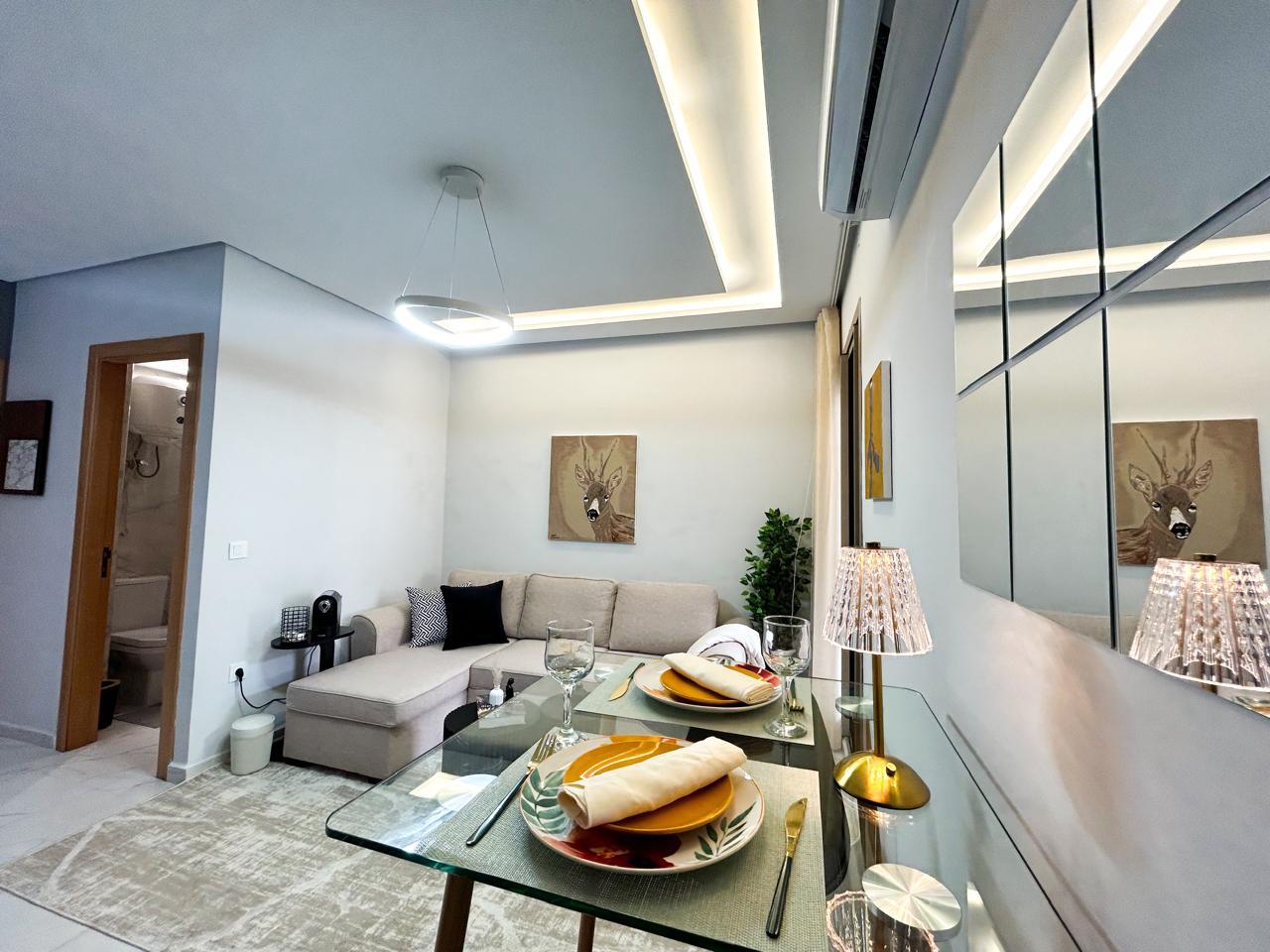Appartement moderne d’une chambre avec un salon moderne, une cuisine américaine ouverte et un balcon, parfait pour profiter de moments de détente.