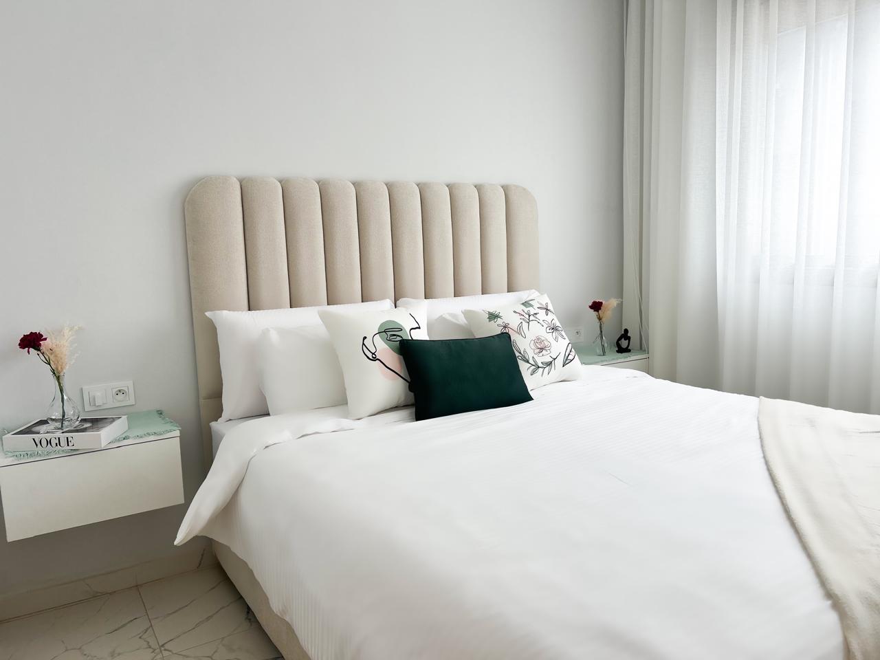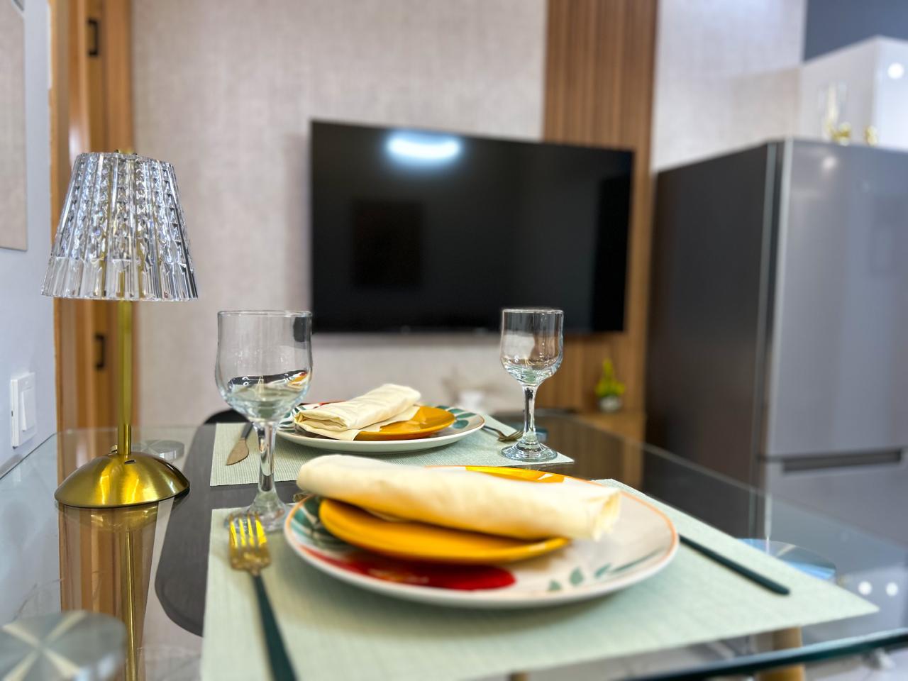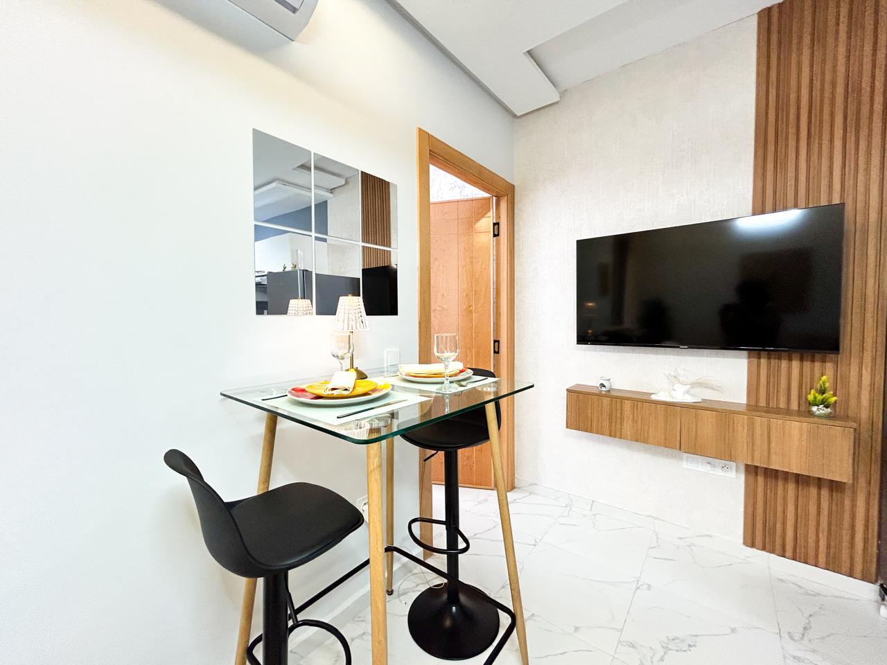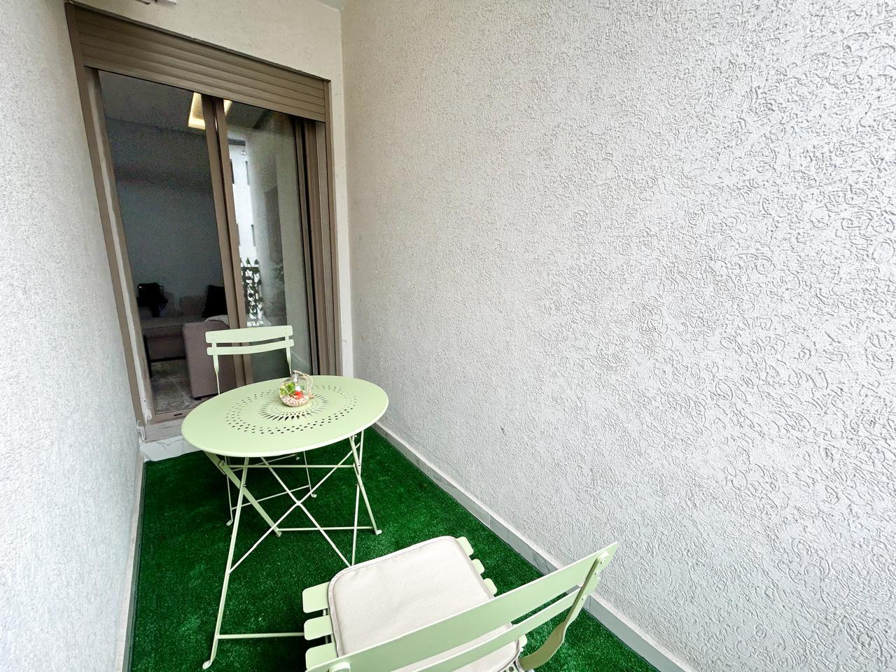 Appartement moderne d’une chambre avec un salon moderne, une cuisine américaine ouverte et un balcon, parfait pour profiter de moments de détente.